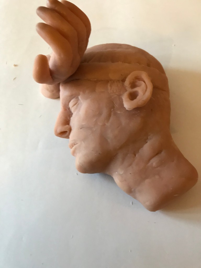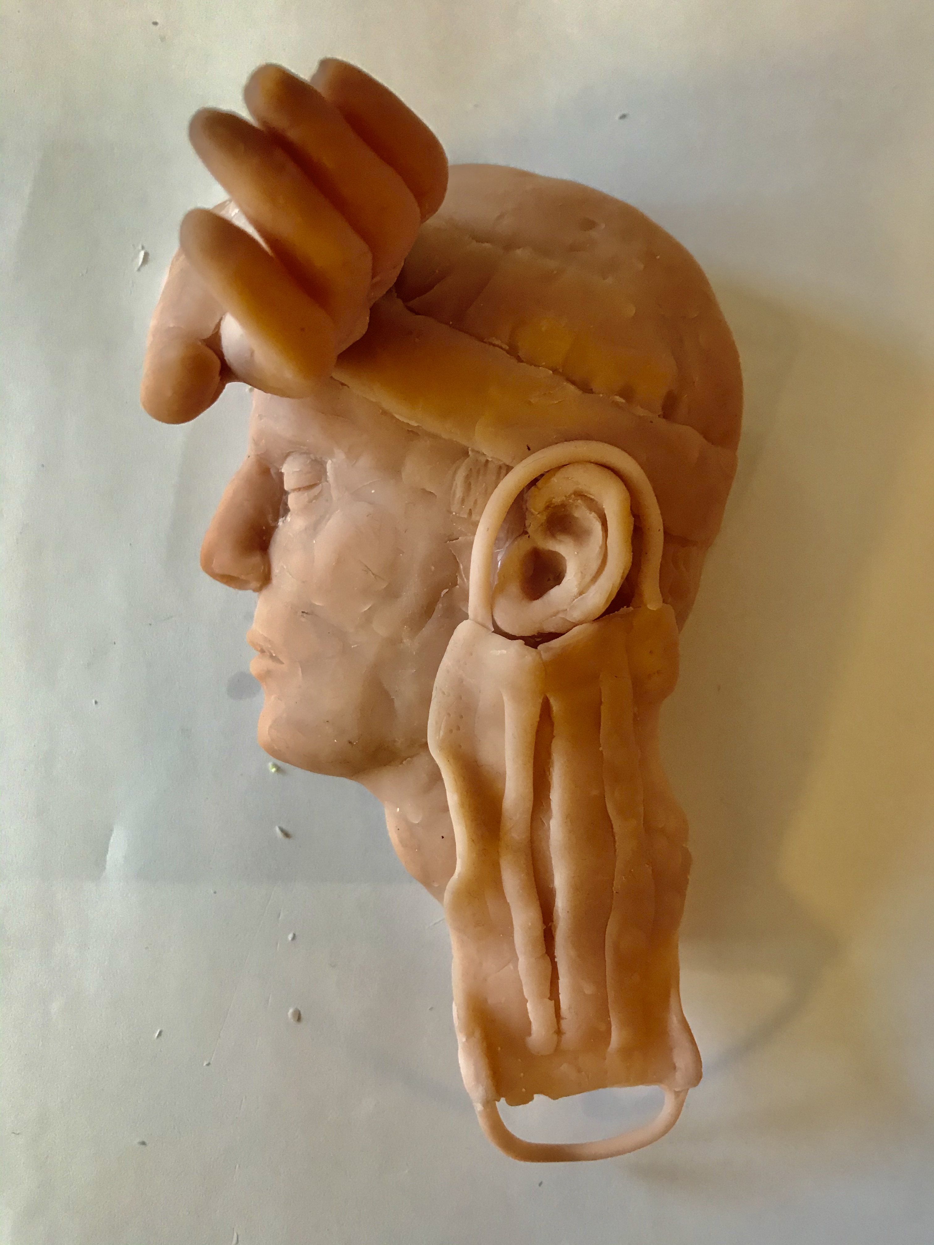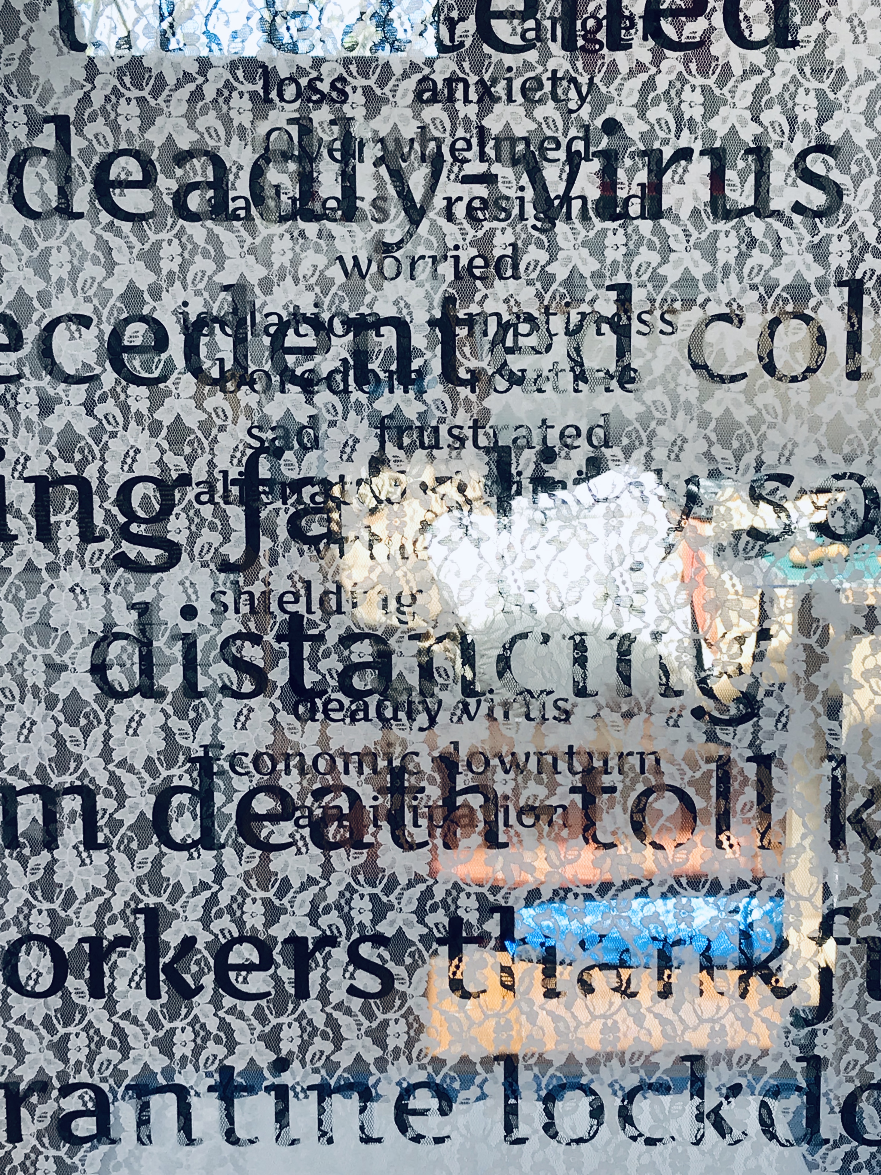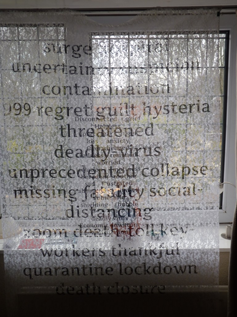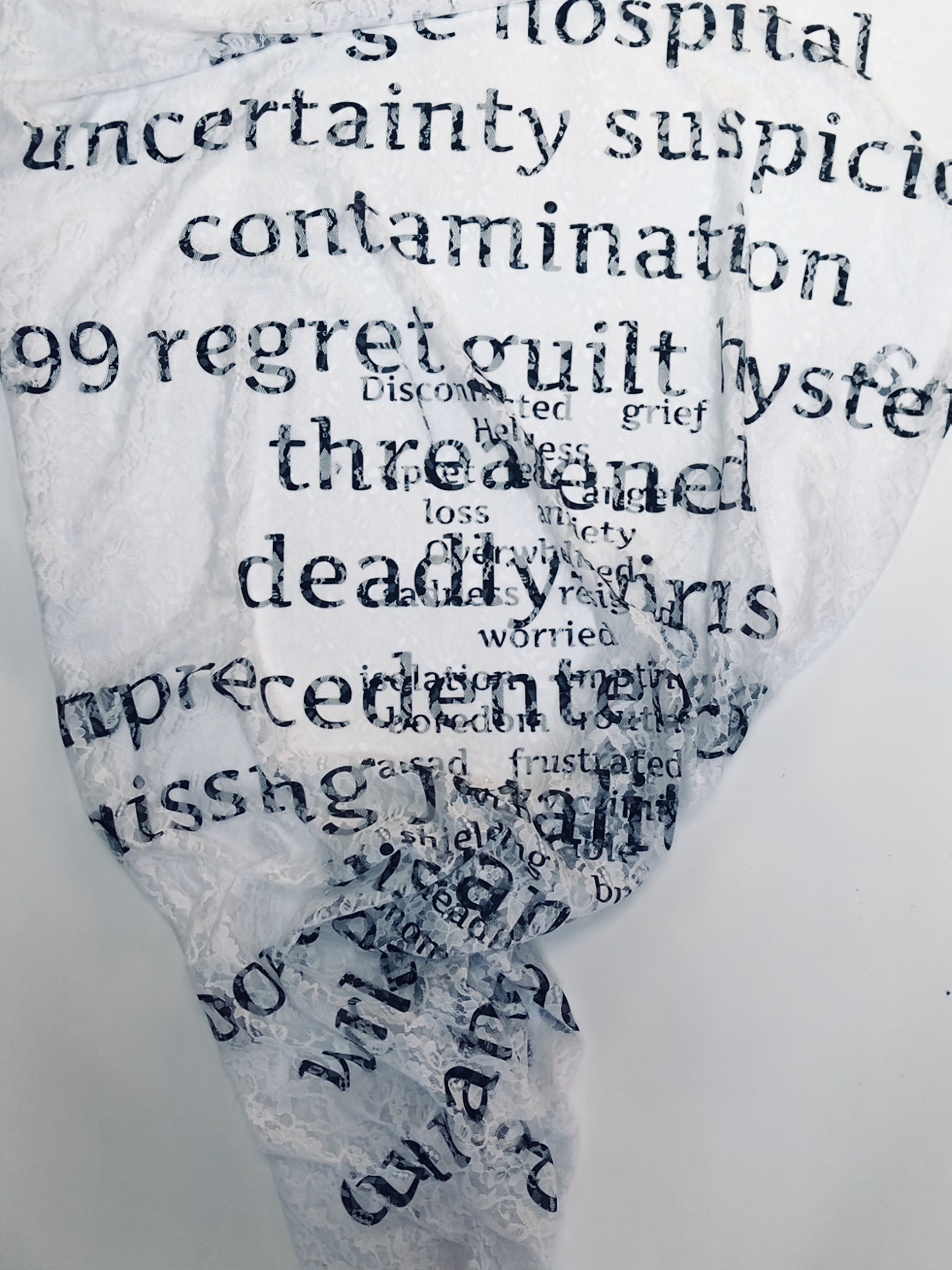 The titles of Aleathea’s recent work are ‘Breath of Air’ detail (on Blossom Lace with Text) ‘Small Relief’ (Polymer Clay) and ‘Conversation Pieces’